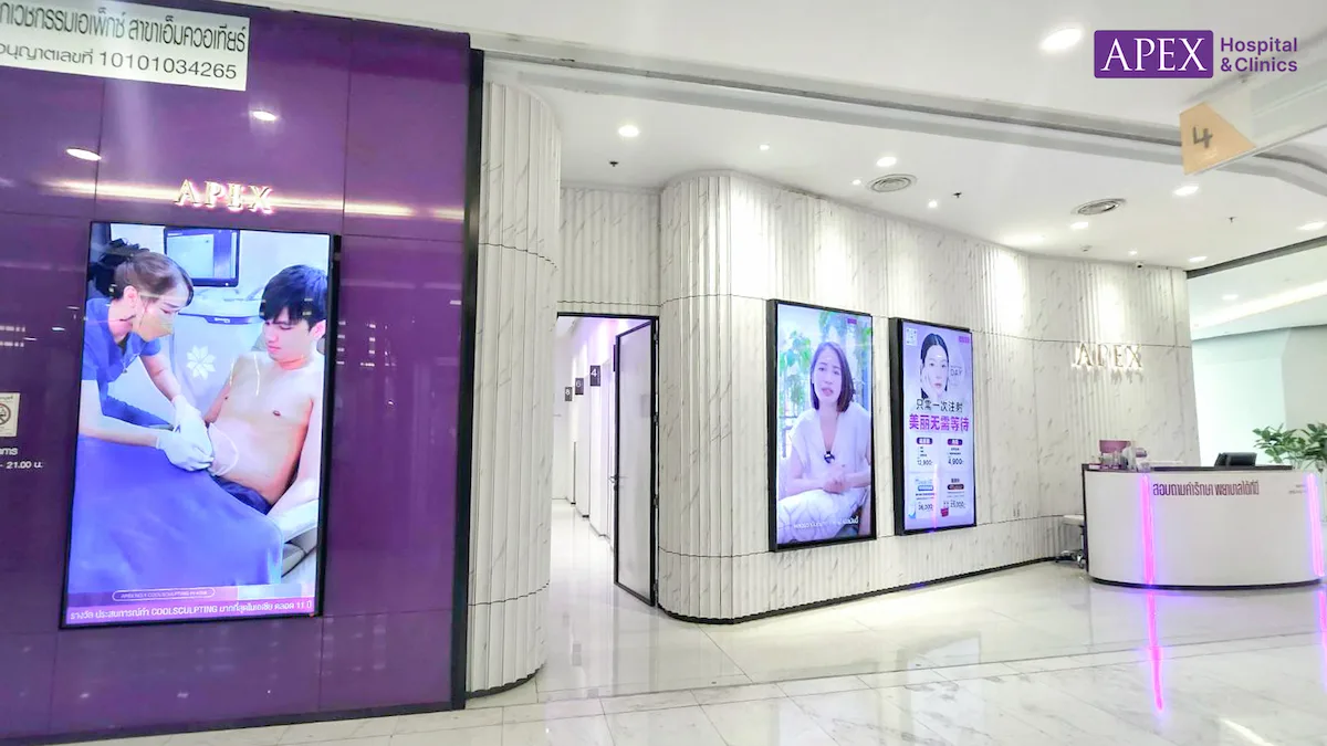 APEX Clinic เอ็มควอเทียร์ ให้บริการด้านความงามในบรรยากาศที่เป็นส่วนตัว ตั้งอยู่ในศูนย์การค้าเอ็มควอเทียร์ ซึ่งเป็นแหล่งไลฟ์สไตล์ใจกลางสุขุมวิทคลินิกให้บริการหัตถการทางการแพทย์สำหรับผู้ที่ต้องการดูแลผิวหน้า ฟื้นฟูสภาพผิว หรือปรับรูปหน้า โดยมีการประเมินจากบุคลากรทางการแพทย์ และวางแผนการดูแลเฉพาะบุคคลอย่างเป็นระบบ ใช้ผลิตภัณฑ์และอุปกรณ์ที่ได้รับการรับรอง มีมาตรฐานความสะอาดในทุกขั้นตอน